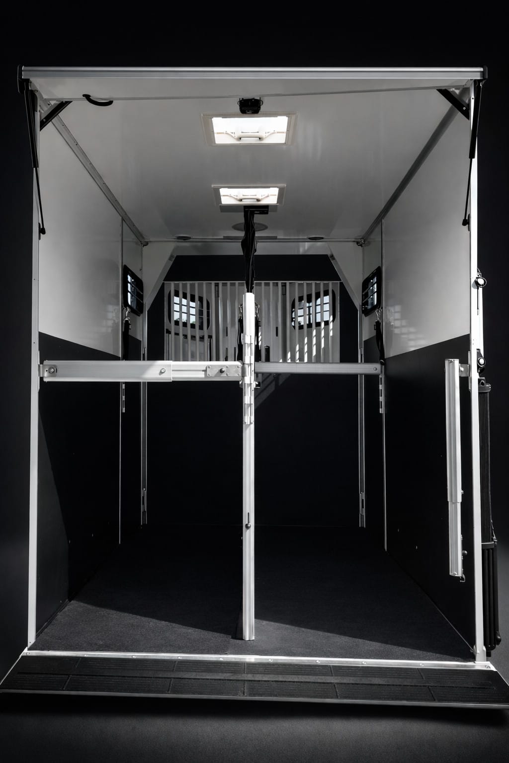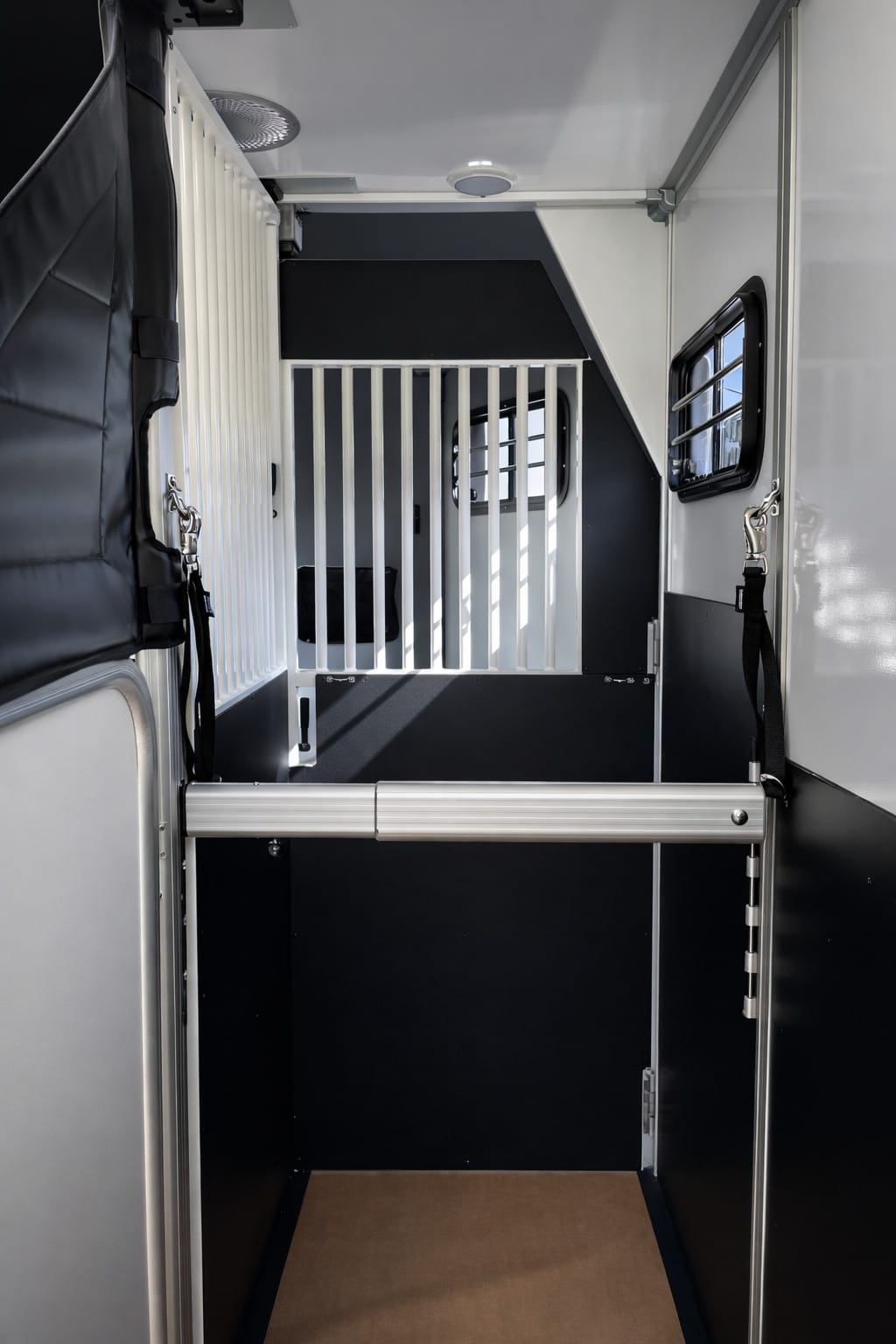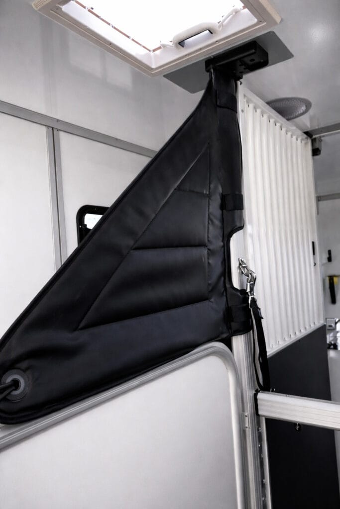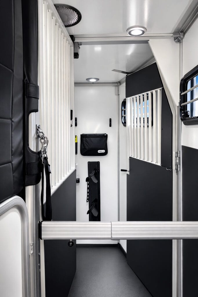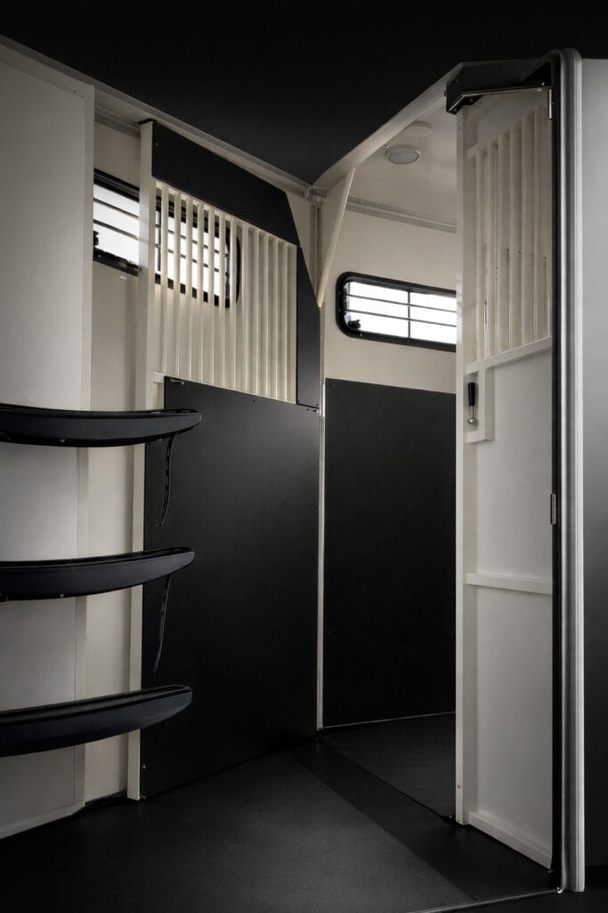 Stuteriinredningen skapar ett öppet och luftigt utrymme där hästarna står som i boxar vilket minskar stress och gör resan mer naturlig och trygg.